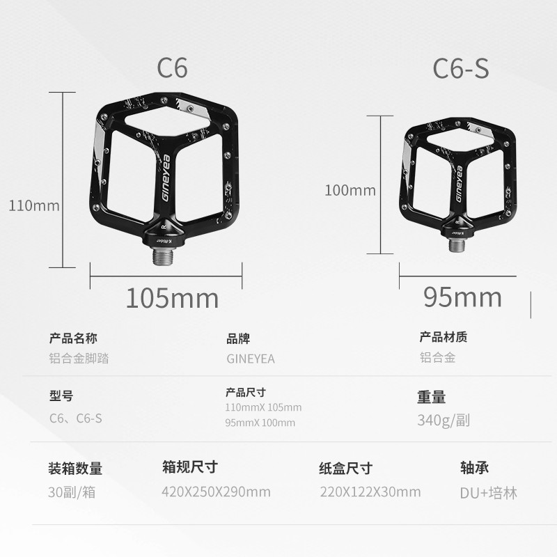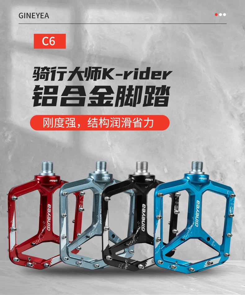 景曄新款C6系列外觀設計比較個性化,造型設計相同,采用嵌套軸心的一個設計,所有邊角尖銳凸起除都經過細致打磨,鋁合金CNC本體,珞鉬鋼軸心,騎行更省力,采用大軸承+襯套的一個設計,尺寸分大中小,大號用于速降,中號用于CX,林道,泵道,小號用于童車