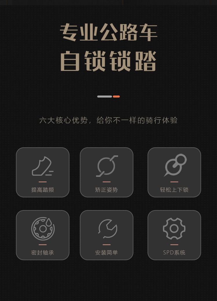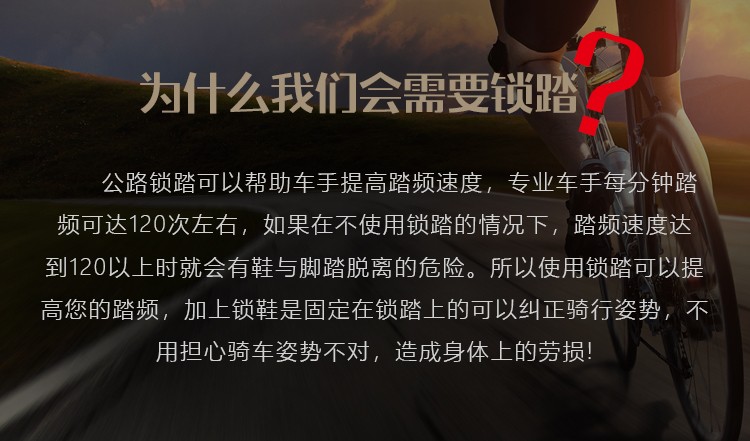 #公路車專業自鎖鎖踏,適用SPD-SL系統,自帶鎖片體驗不一樣的騎行速度、穩定、省力,踏板流線型一體化設計,高強度質量輕的尼龍材料加持,一對鎖踏僅重約278g,鎖片重量約88g,松緊度可調節的張力設置,靈活度更高,統一螺紋口徑14mm。